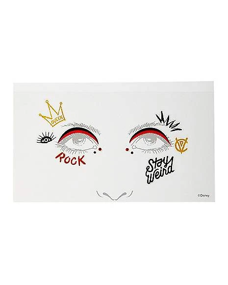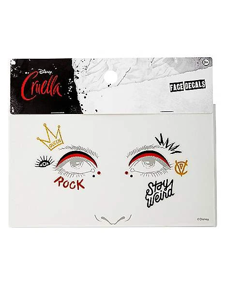 Look like your favorite Disney villain when you adorn yourself with these official Cruella Face Decals! These decals say “Rock” and “Stay weird” as well as featuring a queen’s crown and red and black eyebrows. They’re the perfect way to complete your Cruella costume (sold separately).
