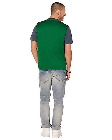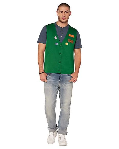 Be kind, rewind! Take a trip down memory lane with this officially licensed plus-size Family Video Vest. This green vest includes three pins that read “Ask me,” “Have a nice day,” and “Rewind!” This look is sure to take you back to the days of VHS tapes, weekend rentals, and carpeted video stores in no time.