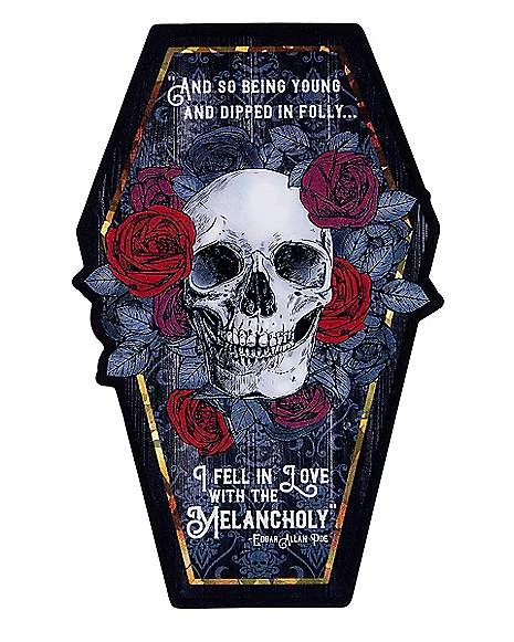 Put your dark side front and center with this Gothic Skull Coffin Magnet! This striking magnet is in the shape of a coffin, with a skull surrounded by roses, and has a quote by Edgar Allen Poe. It’s the perfect magnet for our fridge during the Halloween season or any time.